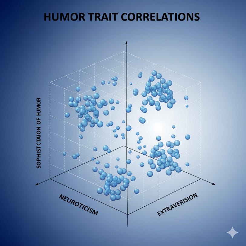 Let’s imagine, entirely for the sake of argument (and also because it’s within the limits of my ability to imagine things spatially), that the number of axes over which people vary is only three.[2] I’ve labeled them “extraversion” and “neuroticism” (which are probably real things) and “sophistication of humor” (which is definitely a real thing). Now note that most, if not all, of the interesting ways that people vary are not binary but are continuous variables (or spectra). I’ve asked Google’s AI Gemini to draw this space for me and to plot a bunch of pretend people in random combinations on the axes below.